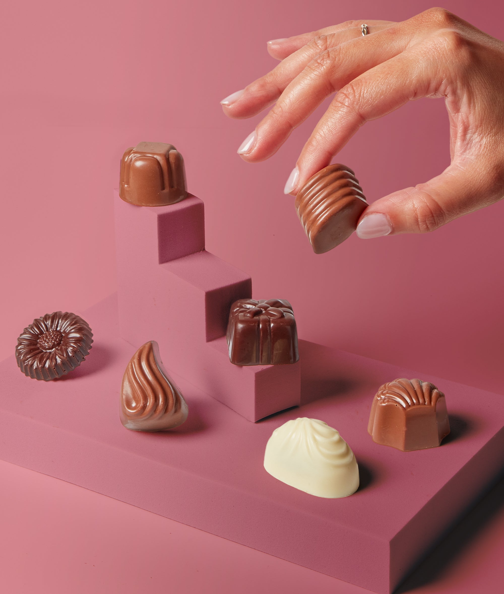Assortment of white, milk and dark Belgian chocolates with a range of caramel, praline and ganache fillings.