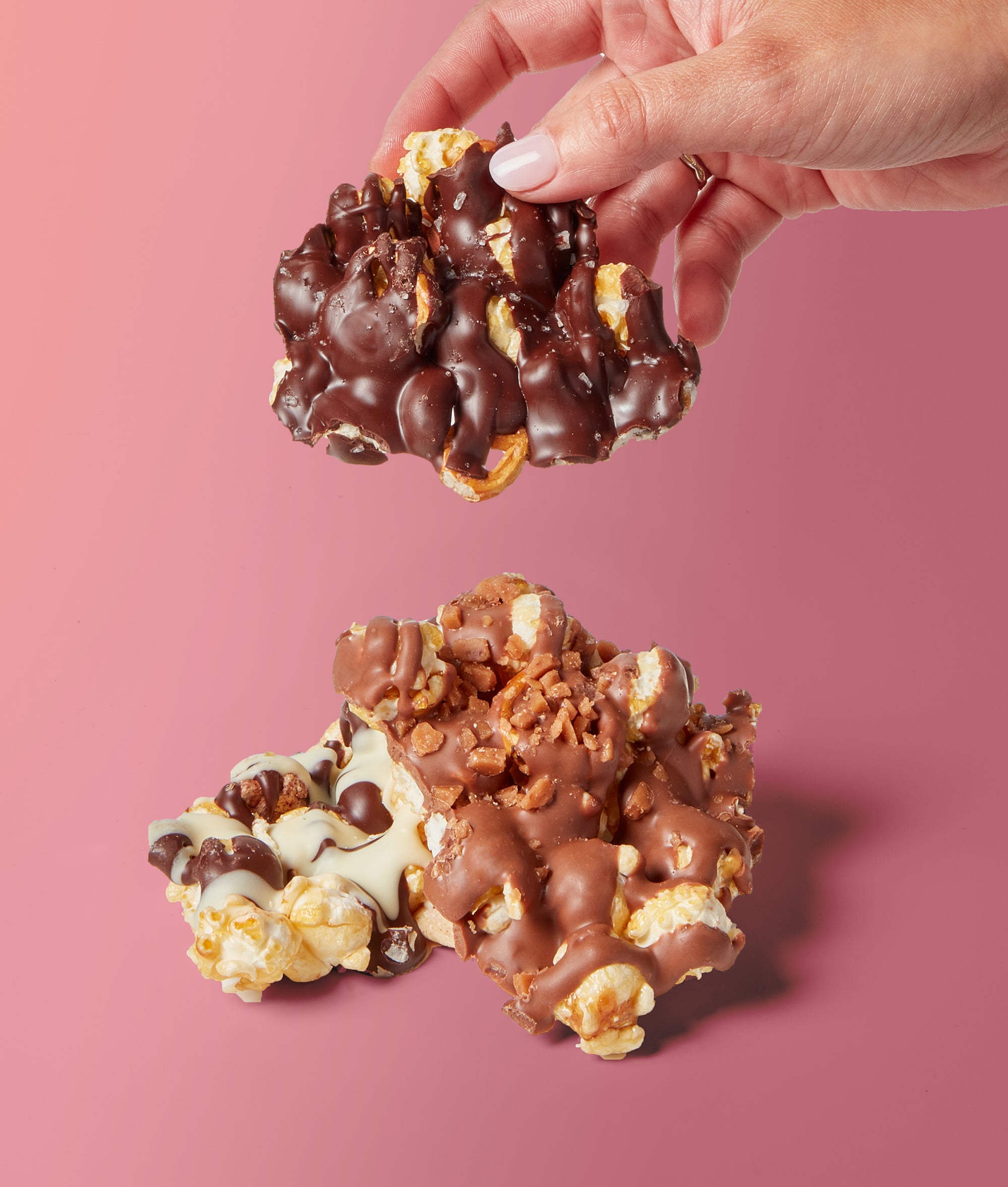 Few can resist our Caramel Popcorn Treats collection. Dive into the beloved flavours of our Classic Caramel Popcorn, where crunchy caramel popcorn balls are masterfully paired with mini pretzels and a combination of white and dark Belgian chocolate. For a nutty twist, tuck into the Pecan Pie Popcorn, seamlessly combining crunchy caramel popcorn balls with a medley of nuts, mini pretzels, toffee pieces, and milk Belgian chocolate.